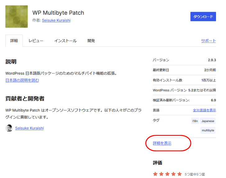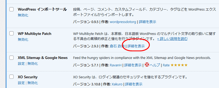まず、WordPress管理画面のプラグインの一覧から、「詳細を表示」をクリック。